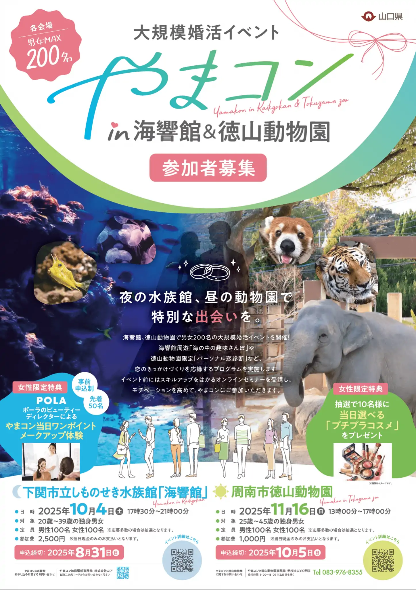 また、昼の賑やかな雰囲気が魅力の「徳山動物園」でも、デジタルスタンプラリーやグループトークを取り入れた婚活形式で楽しめる大規模婚活イベント「やまコン in 徳山動物園」も開催されます。