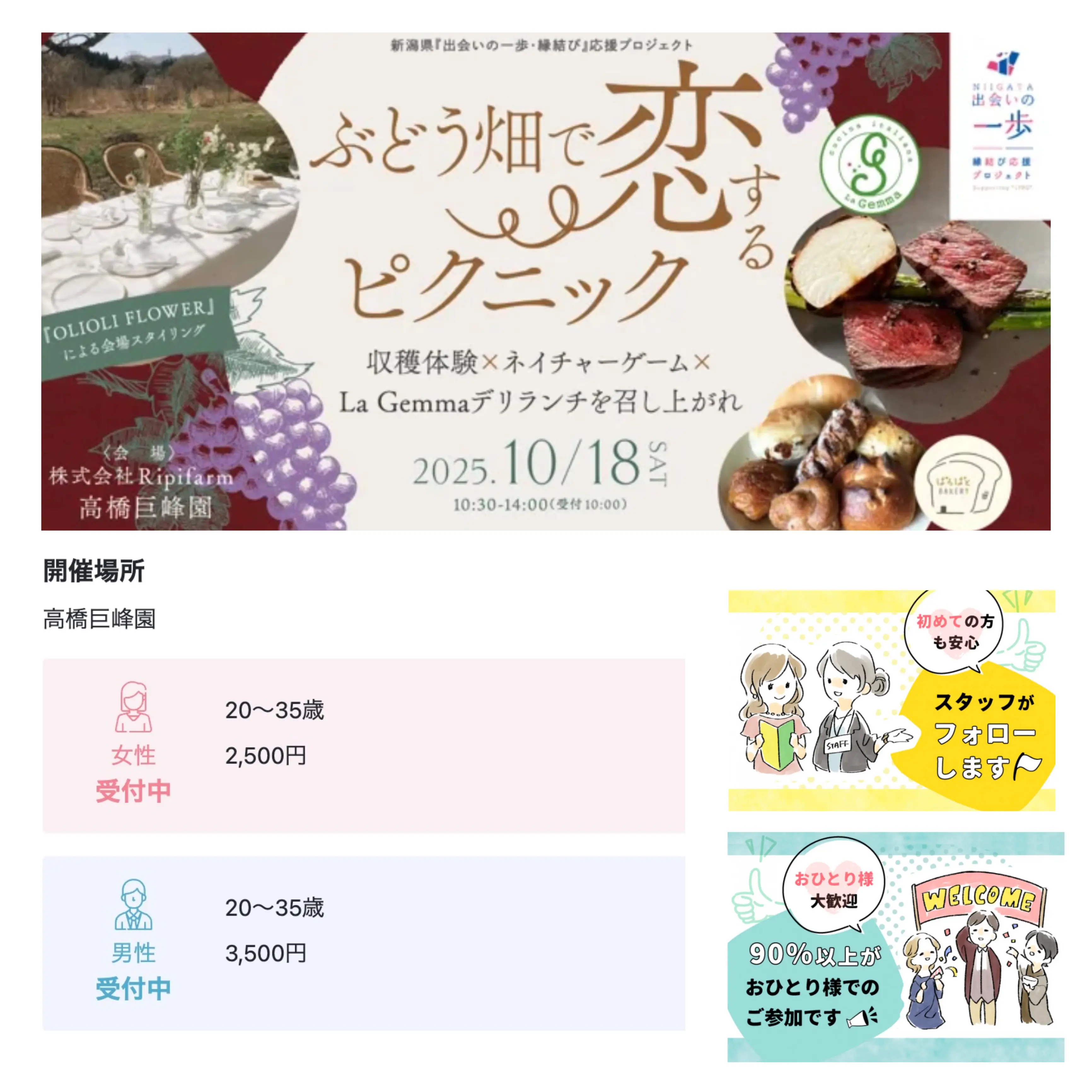 たとえば、白山神社周辺の落ち着いた街並みを散策したり、萬代橋ややすらぎ堤での季節イベント&ピクニック交流など、地域ならではの体験を通じて自然な出会いが生まれるイベントが人気を集めています。