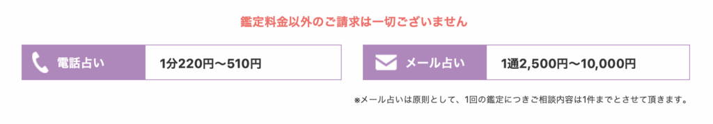 最近はネット回線利用で通話料0円にしている電話占いサイトも増えてきましたが、フィールは通話料金と鑑定料の両方が発生する点に注意が必要。