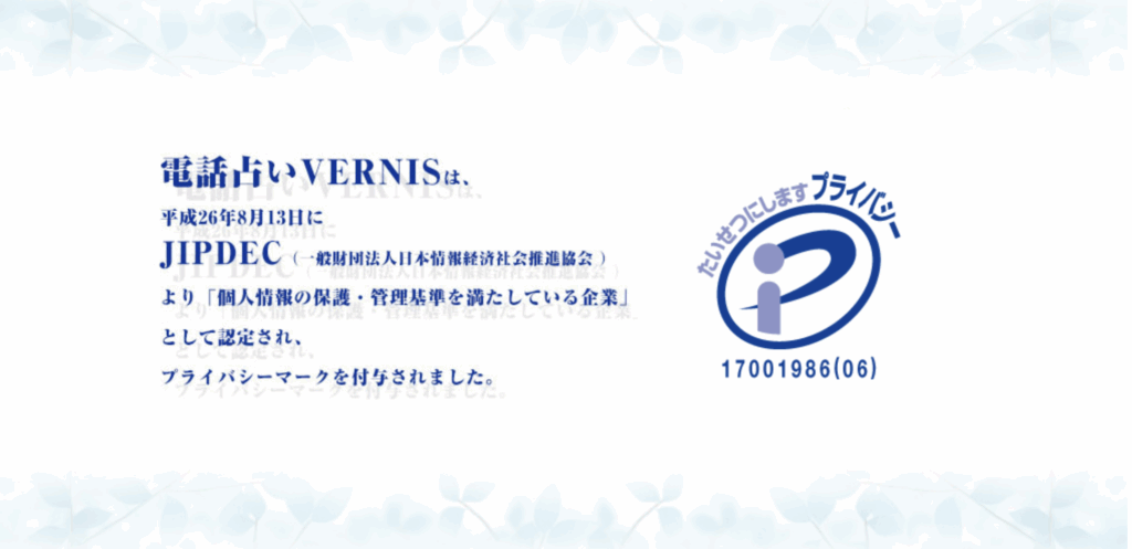 また、電話占いヴェルニはPマーク(プライバシーマーク)を取得していることもポイント。