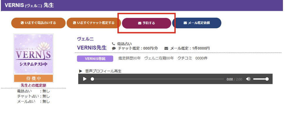 希望の日時に鑑定予約したい場合、もしくは順番待ちに並びたい場合は「予約する」を選んでクリック