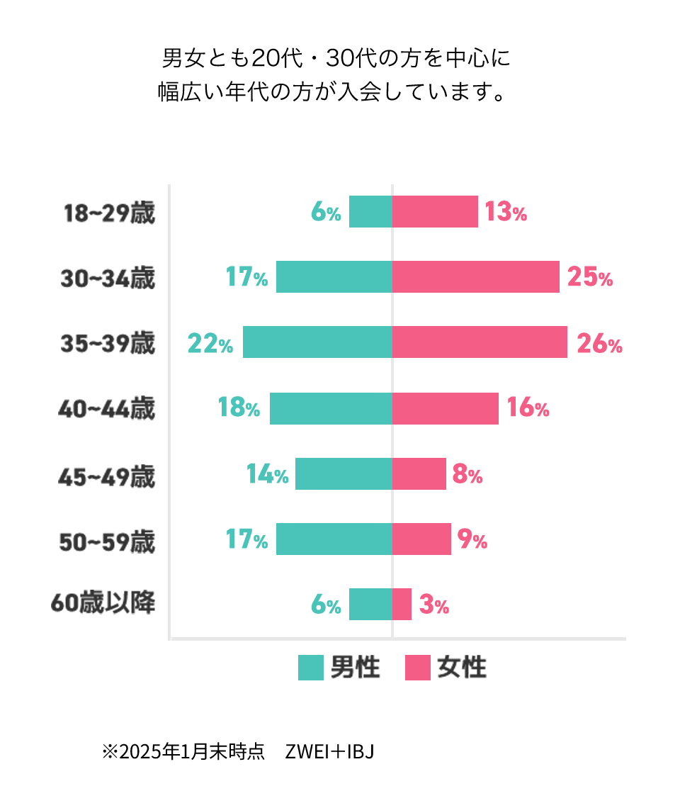結婚相談所業界で、最大級の会員数を誇るツヴァイのデータを見ると、2022年10月の入会者のうち、全体のほぼ8割を20~30代が占めており、女性に限るとなんと全体の4割近くが20代が占めているという結果になっています。