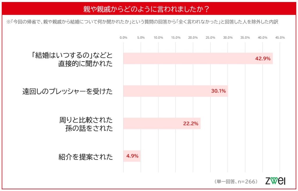 そのうち、最も多かったのは「結婚はいつするの」などと直接的に聞かれたケース(42.9%)。次いで「遠回しのプレッシャー」を受けた(30.1%)、「周りと比較された・孫の話をされた」(22.2%)が続きました。また、「紹介を提案された」と回答した人も4.9%となっています。