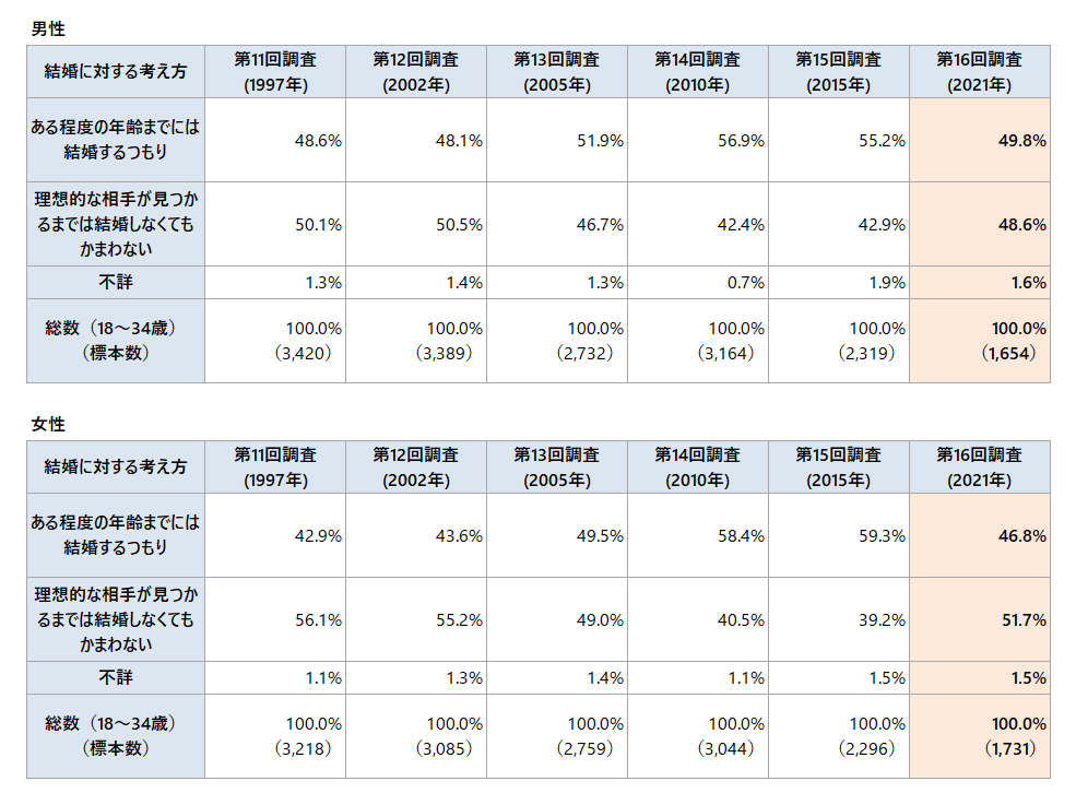 国立社会保障・人口問題研究所の調査(2021年)によると、「理想的な相手が見つかるまでは結婚しなくてもかまわない」と考える人が増えています。