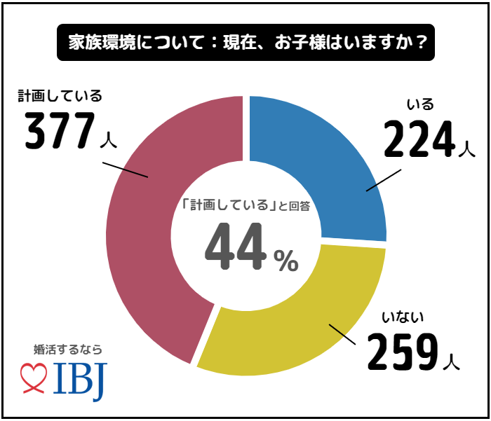たとえば、子どもについては婚活総合サービス 株式会社IBJの調査(【調査レポート】結婚相談所の「成婚者」に聞く『結婚後の変化と、夫婦の暮らし』)結果をみても、結婚相談所で出会い結婚した夫婦のうち約3割の方が「いる」、4割以上の方が「計画している」とのこと。