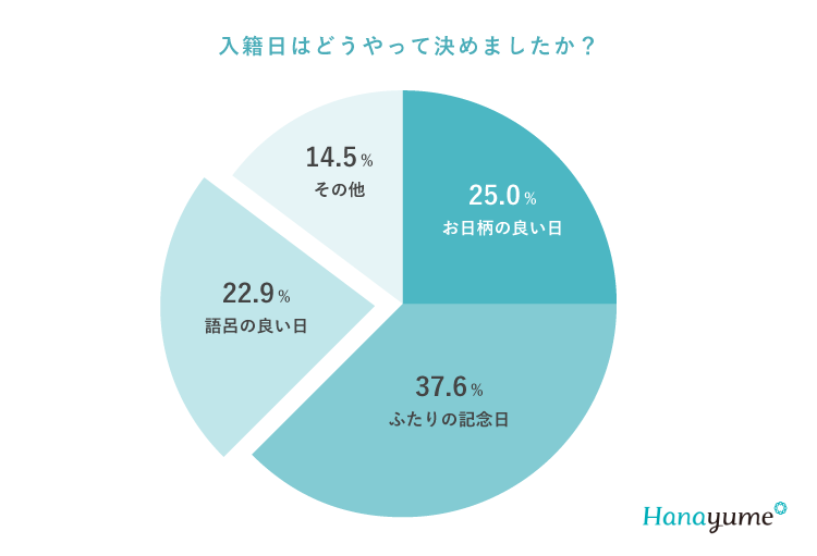 アニヴェルセル総研のアンケートによると、ふたりの記念日を入籍日に選んでいるカップルが多いようです。