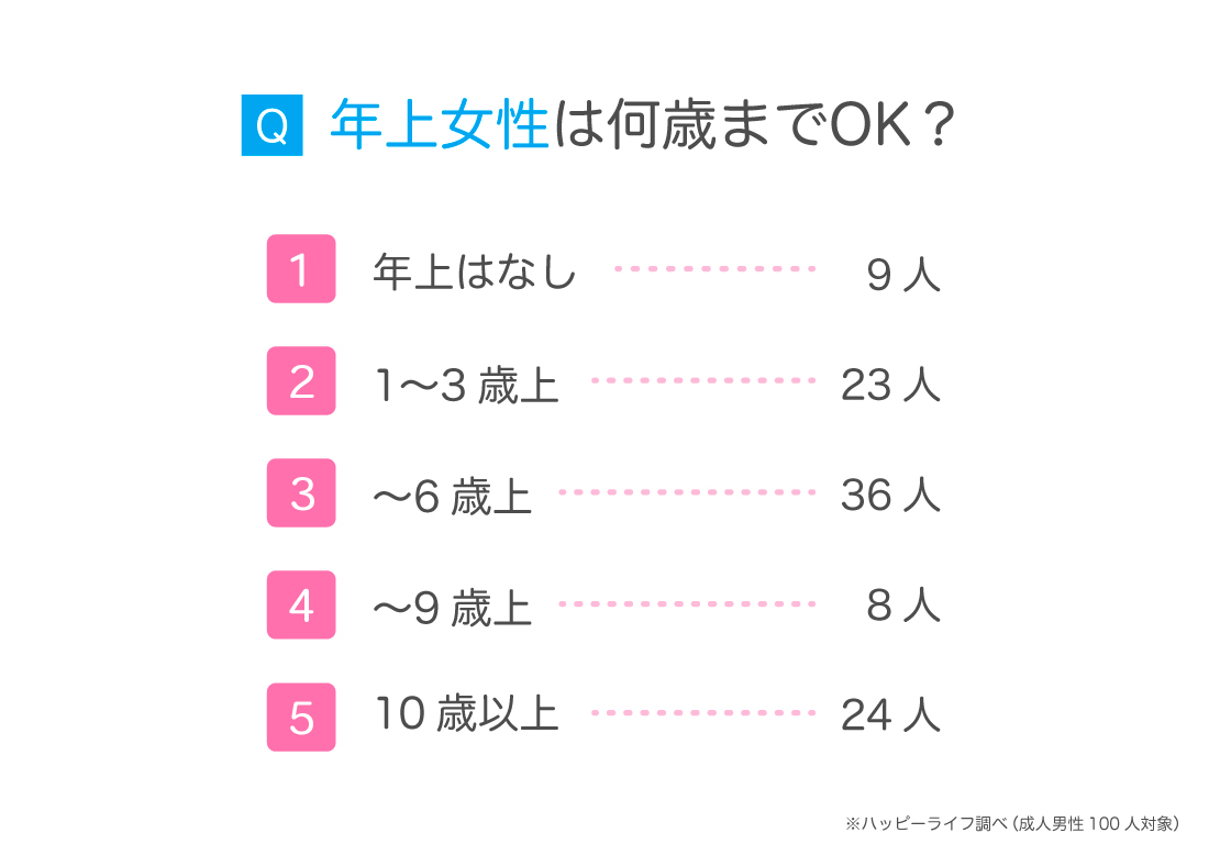 ちなみに、「何歳までOK?」という質問には、「〜6歳上」(36人)が最も多い回答に。6歳上まで恋愛対象としている男性が多いようです。