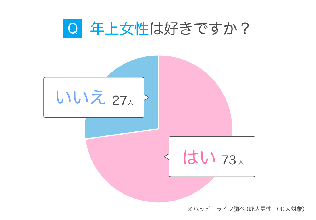 ハッピーライフが成人男性100人に実施した調査によると、「年上女性は好きですか?」の質問に対し、73人が「はい」と回答しました。
