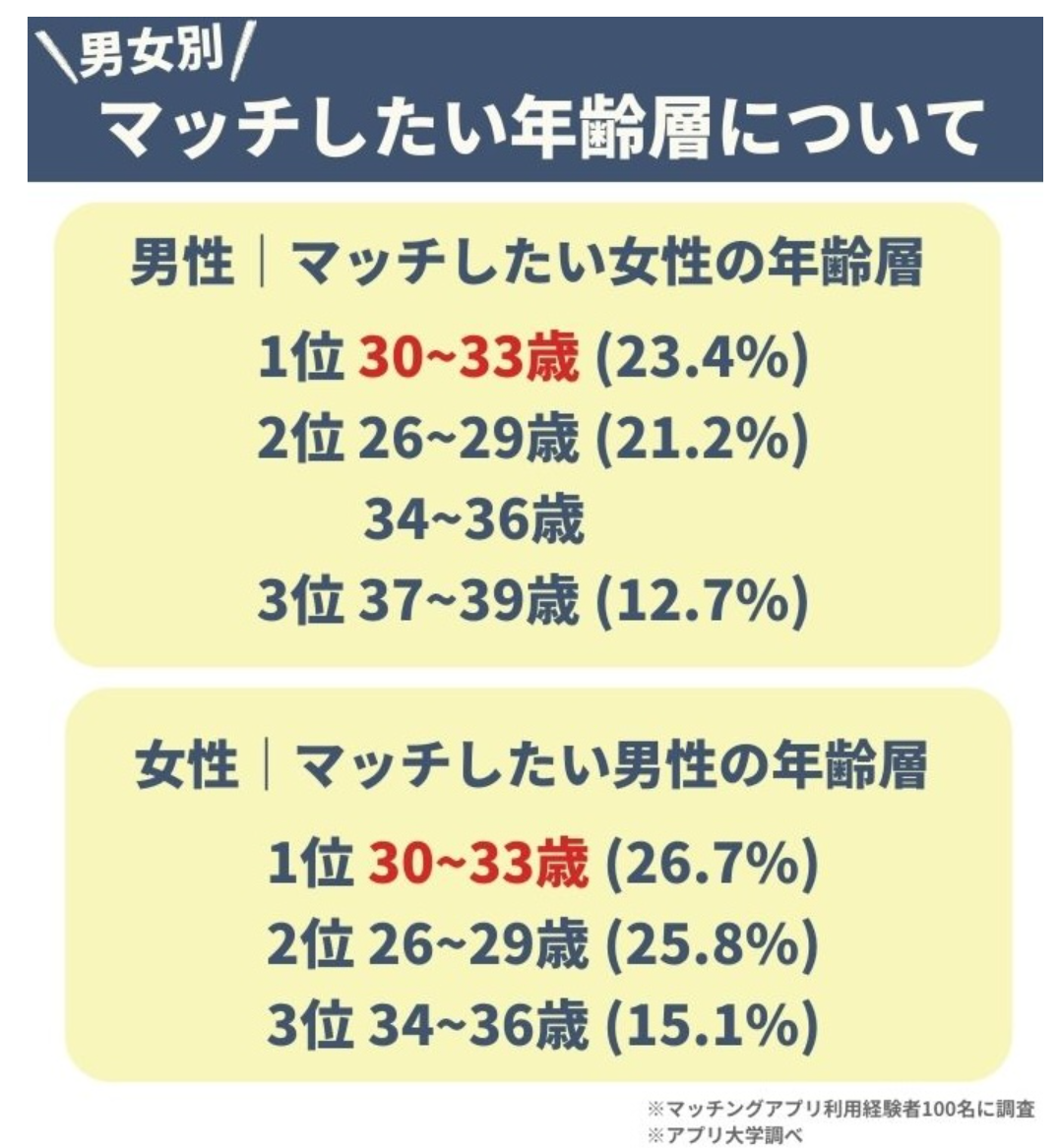マッチングアプリ大学が行った調査データによると、「男性がマッチングアプリでマッチしたい女性の年齢層」として、1位は30~33歳、2位は26~29歳、3位は37~39歳でした。