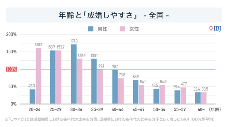とくに、20代や30代前半の男性と比較すると、50代男性の成婚率は低くなっています。