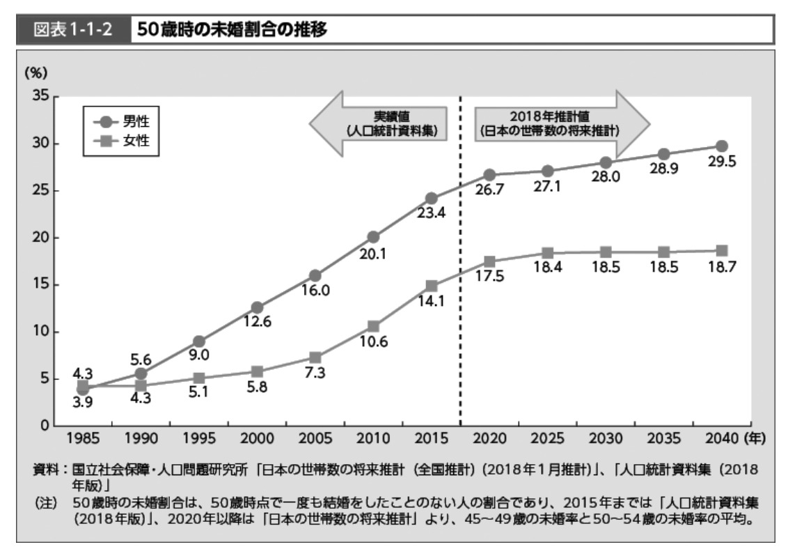 男女ともに未婚の割合は上昇し続けており、今後も増えていくと予想されています。