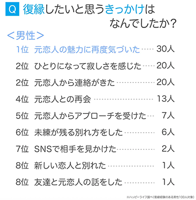 第2位は、男性では第1位だった「元恋人の魅力に再度気付いた」でした。