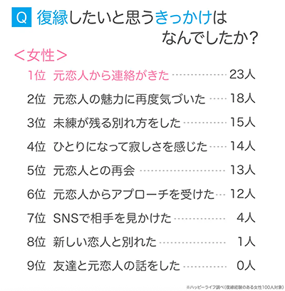 復縁を望むきっかけの1位は、「元恋人から連絡がきた」でした。