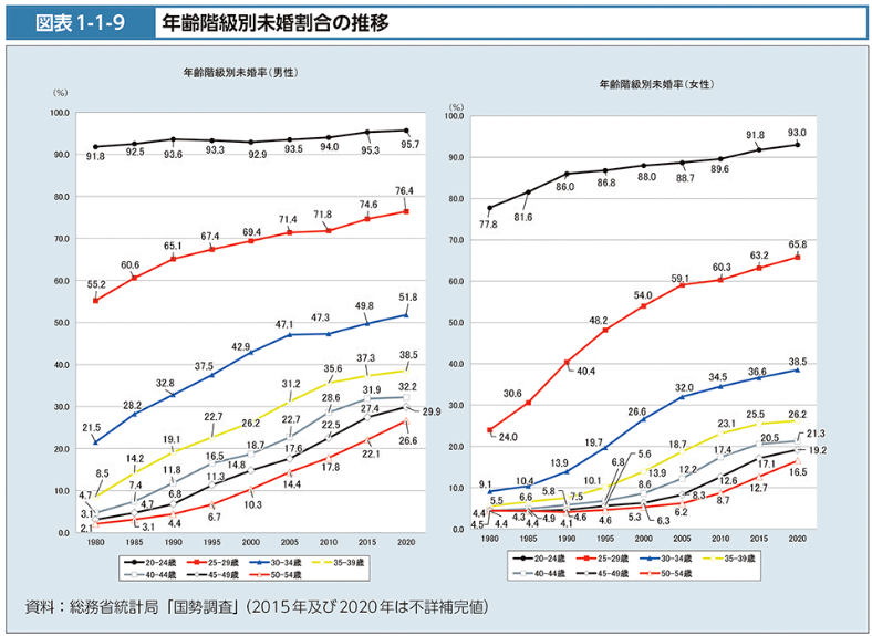 厚生労働省の『令和5年版 厚生労働白書』によると、1990年から2020年までのデータではすべての年齢層で未婚率が上昇傾向にあることが明らかになっています。
