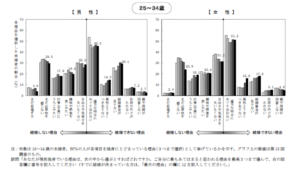 実際、国立社会保障・人口問題研究所の調査からも、独身でいる理由として「結婚をする積極的な理由が見つからない」「25歳を過ぎると、適当な相手に出会えない」