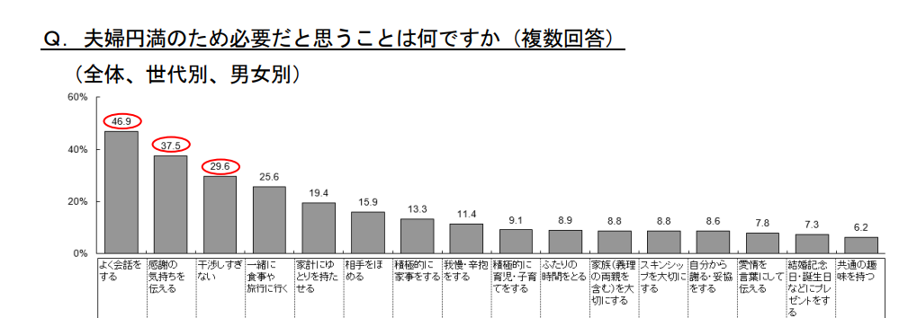 多くの人が、夫婦において、会話が一番大切だと思っていることがわかりますね。