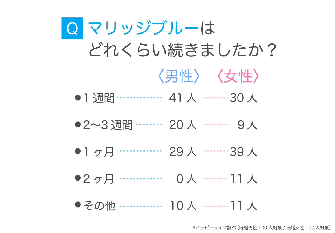 男女ともに「1週間」「1ヶ月」と回答した人が多く、ほとんどの人が1ヶ月以内にマリッジブルーから立ち直っていることがわかります。
