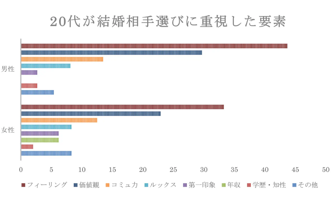 フィーリングを選んだ人の回答を深掘りすると、同時に「価値観」や「コミュ力」といったものを挙げており、フィーリングの正体は、金銭や容姿ではなく「自然体でいられる安心感」や「価値観の一致」にあることが明らかになりました。