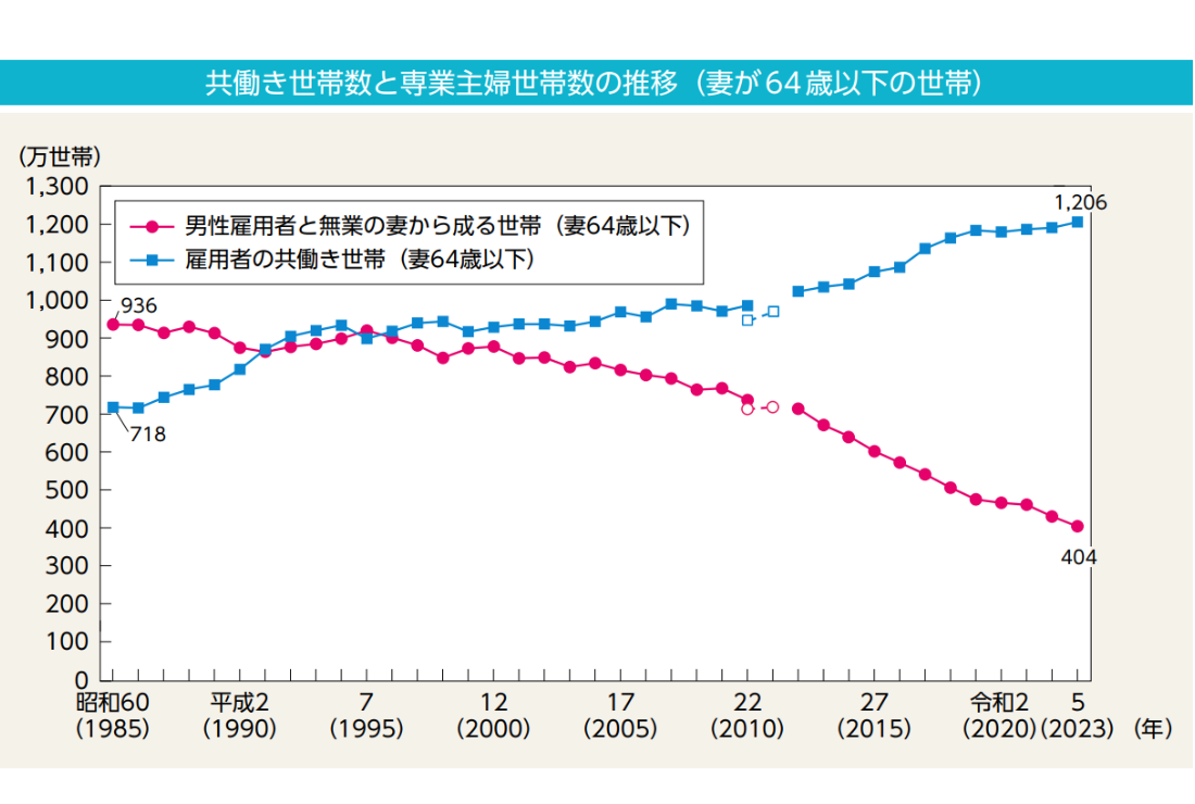 2024年に内閣府が発表した調査によると、共働き世帯は1,206万世帯、男性雇用者の無業の妻の世帯は404万世帯と、全体の75%が夫婦共働き世帯です。