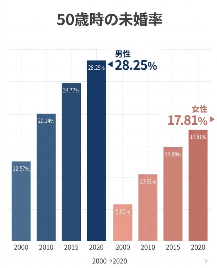 実際、国立社会保障・人口問題研究所の『人口統計資料集(2025年版)』によると、50歳時点で一度も結婚したことがない人の割合は、2020年時点で男性28.25%、女性17.81%まで上昇しています。