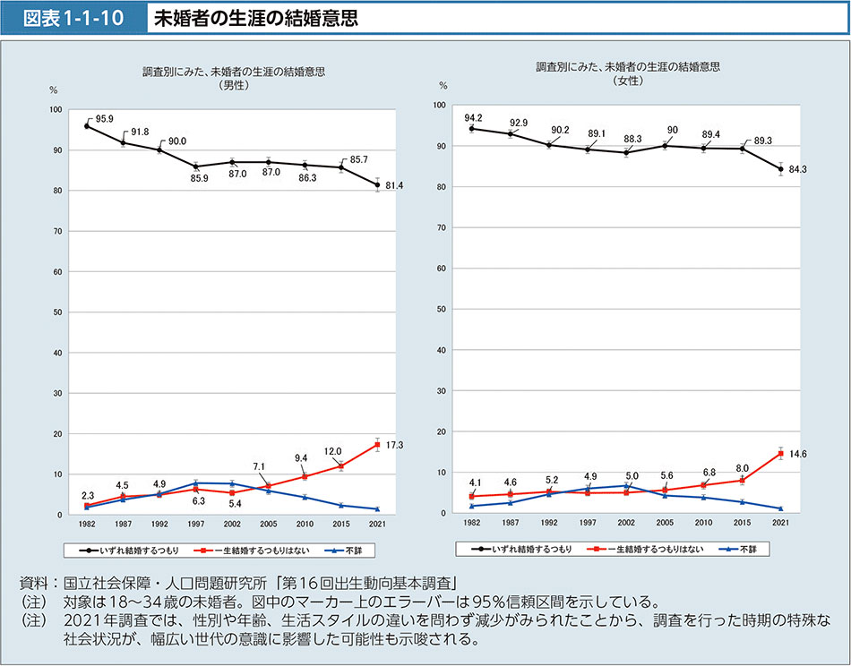 引用元:厚生労働省「令和5年版厚生労働白書-つながり・支え合いのある地域共生社会- 図表1-1-10 未婚者の生涯の結婚意思」