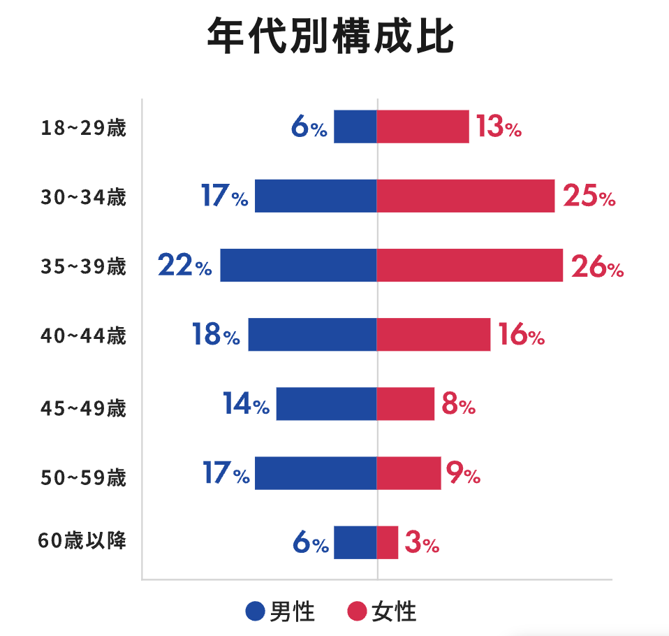 ツヴァイの会員数は11.0万人*と豊富で、年代別構成比を見てみると20代から30代が中心。