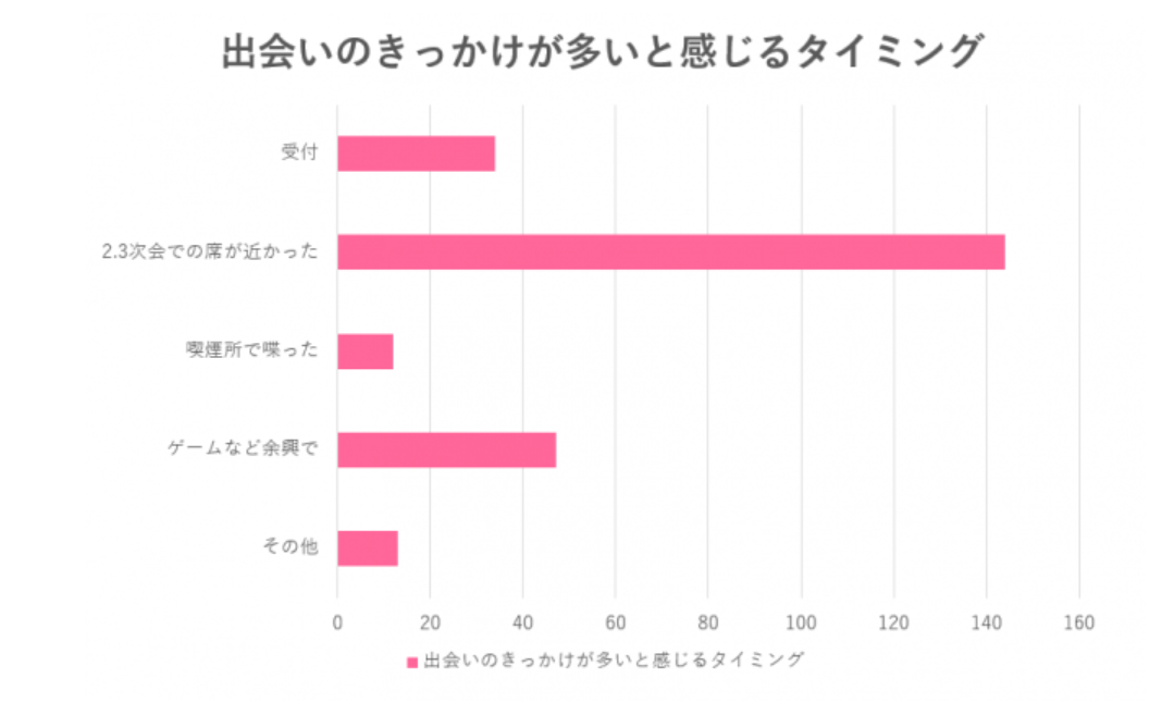 さらに同調査で、「出会いのきっかけが多いと感じるタイミング」を質問したところ、「二次会・三次会での席が近かった」と答えた人が144名で一番多い結果になりました。
