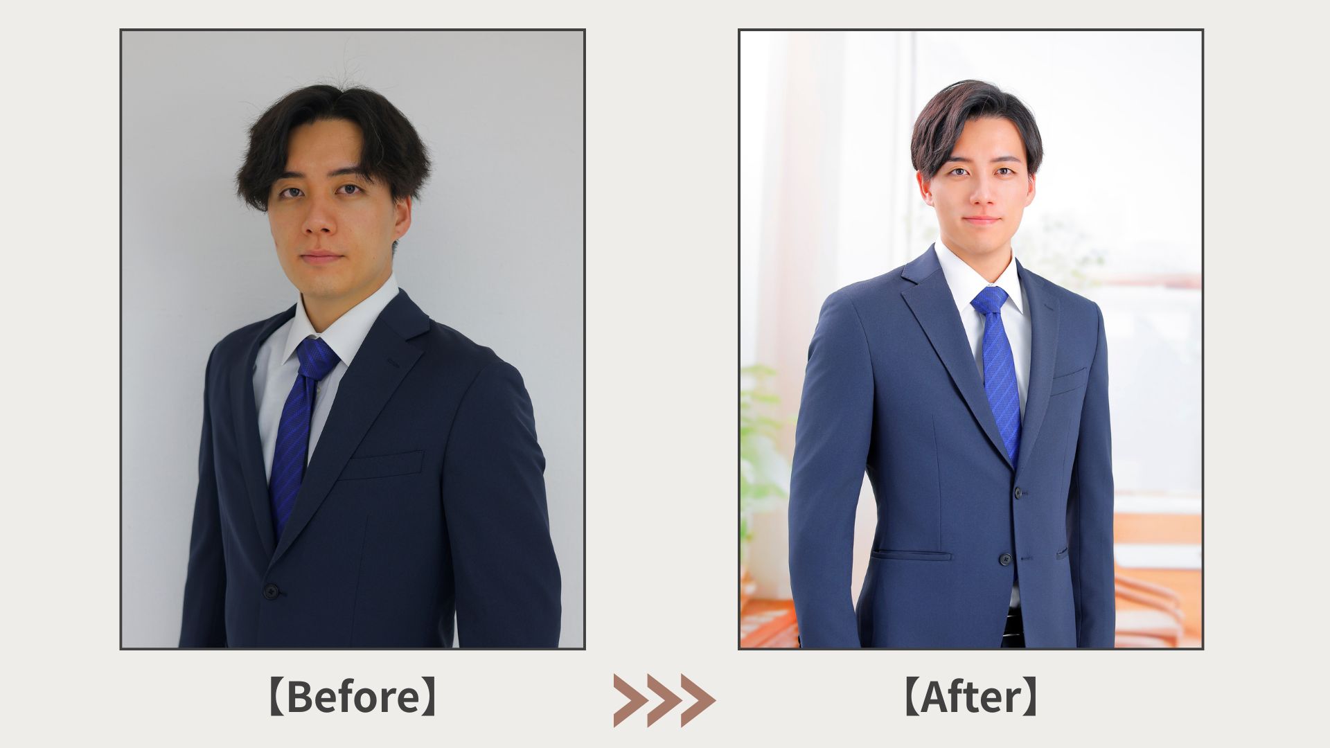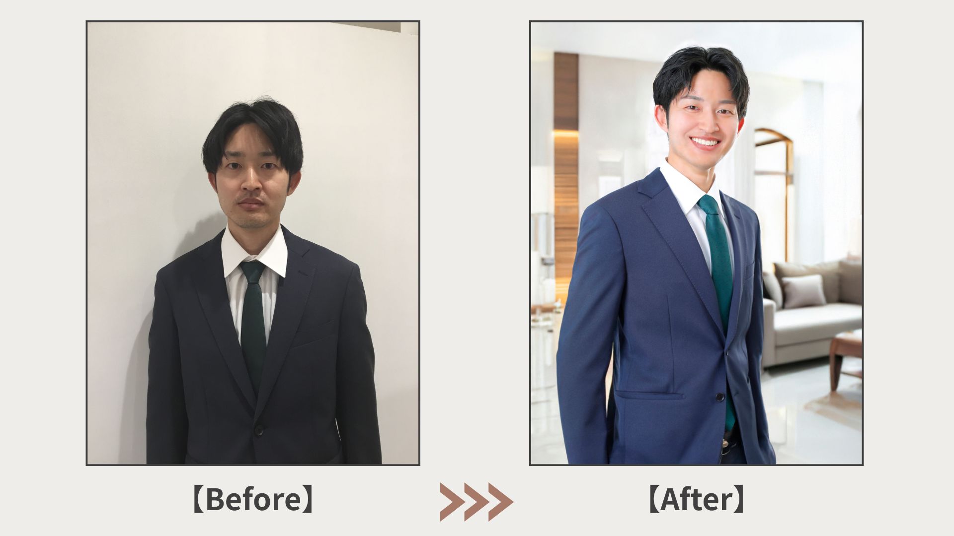 ・Before:表情がやや硬く、少し距離を感じさせる印象。暗めのスーツも相まって、全体的に重たい雰囲気になっています。