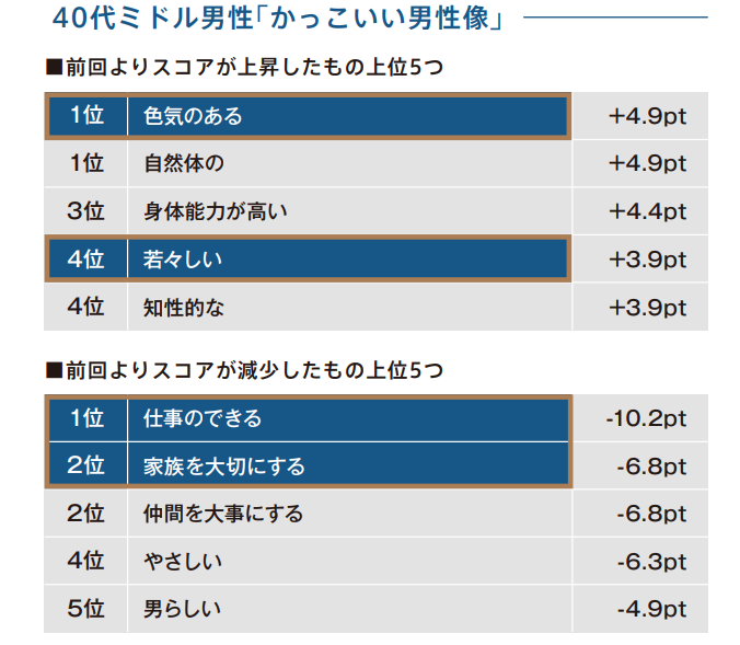 ルシードの「ミドル男性白書2023」より、“外見を磨くこと”を重要視する人が増えており、かっこいい男性像にも「色気」、「身体能力」、「若々しさ」など外見の要素が挙がりました。