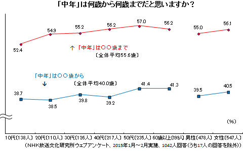 NHK放送文化研究所が行った意識調査の結果によれば、人々が考える「中年」とは平均して「40.0歳から55.6歳まで」を指すという傾向が出ています。